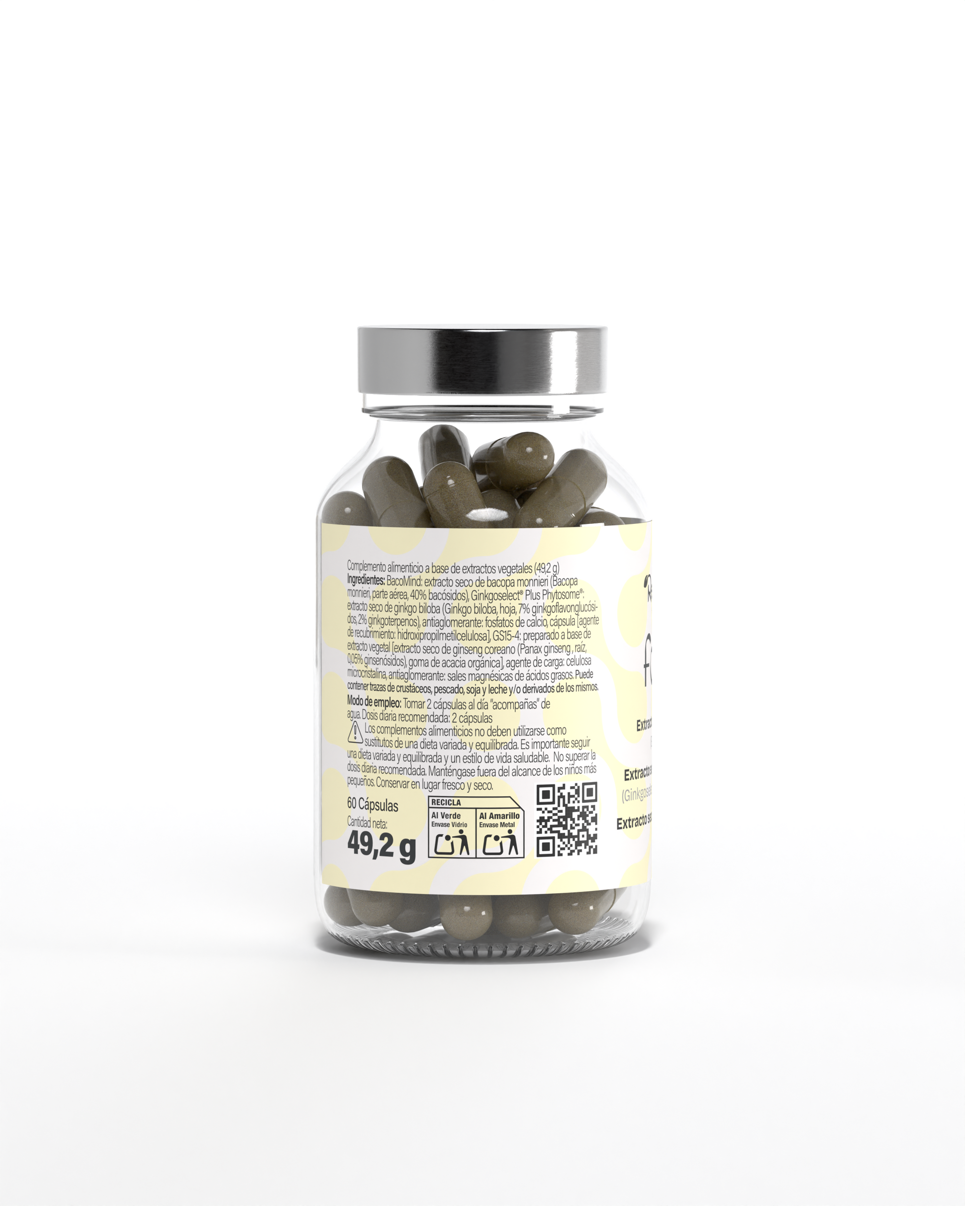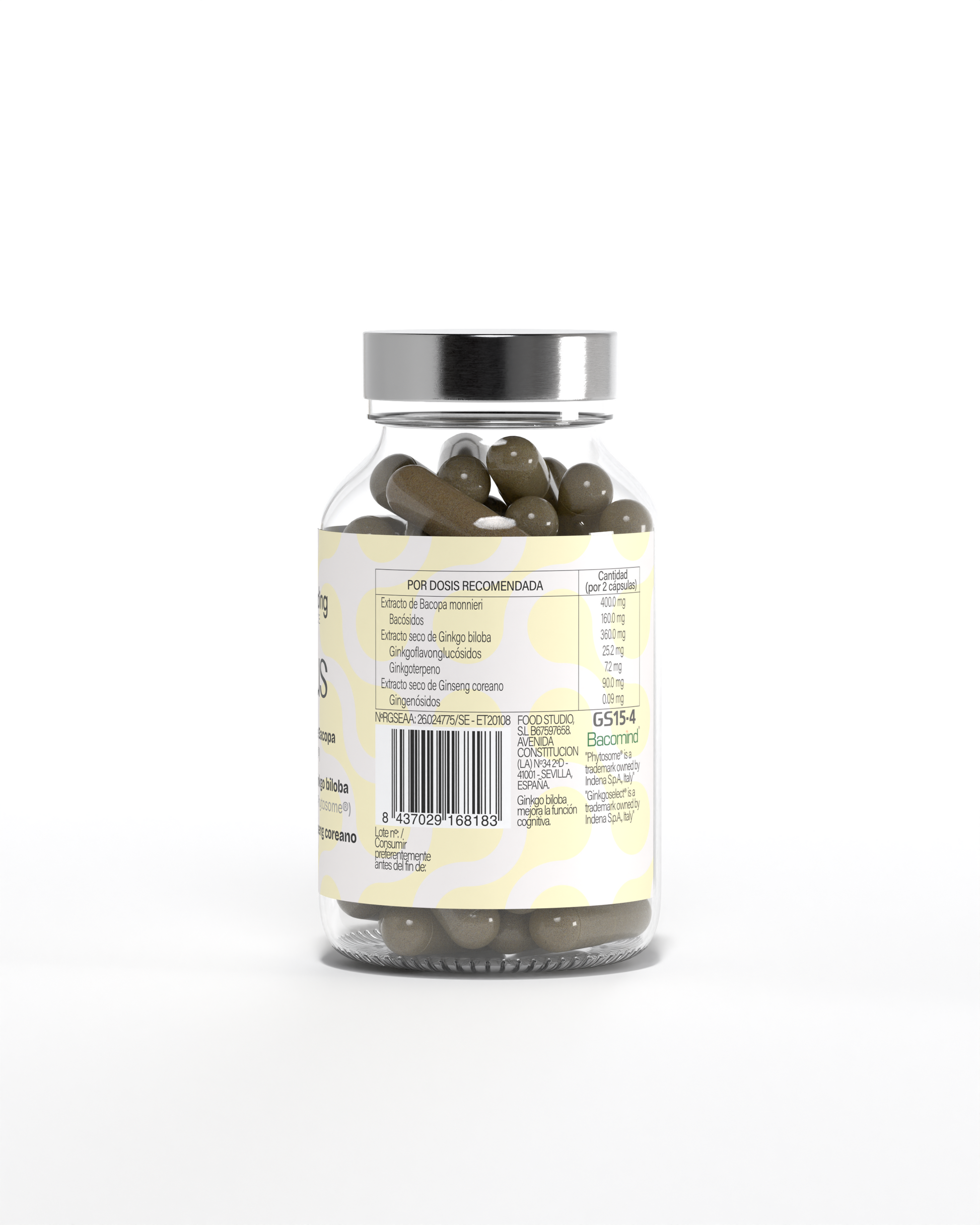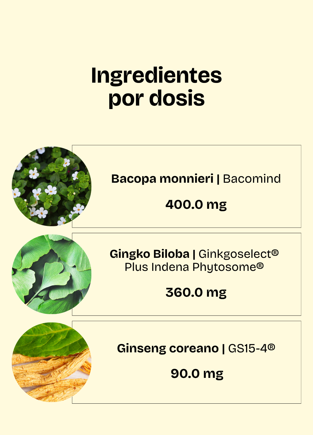 *La dosis diaria aporta 400 mg de extracto seco de Bacopa monnieri (BacoMind®), 360 mg de extracto seco de Ginkgo biloba (Ginkgoselect® Plus Phytosome®) y 90 mg de extracto seco de ginseng coreano (GS15-4®).