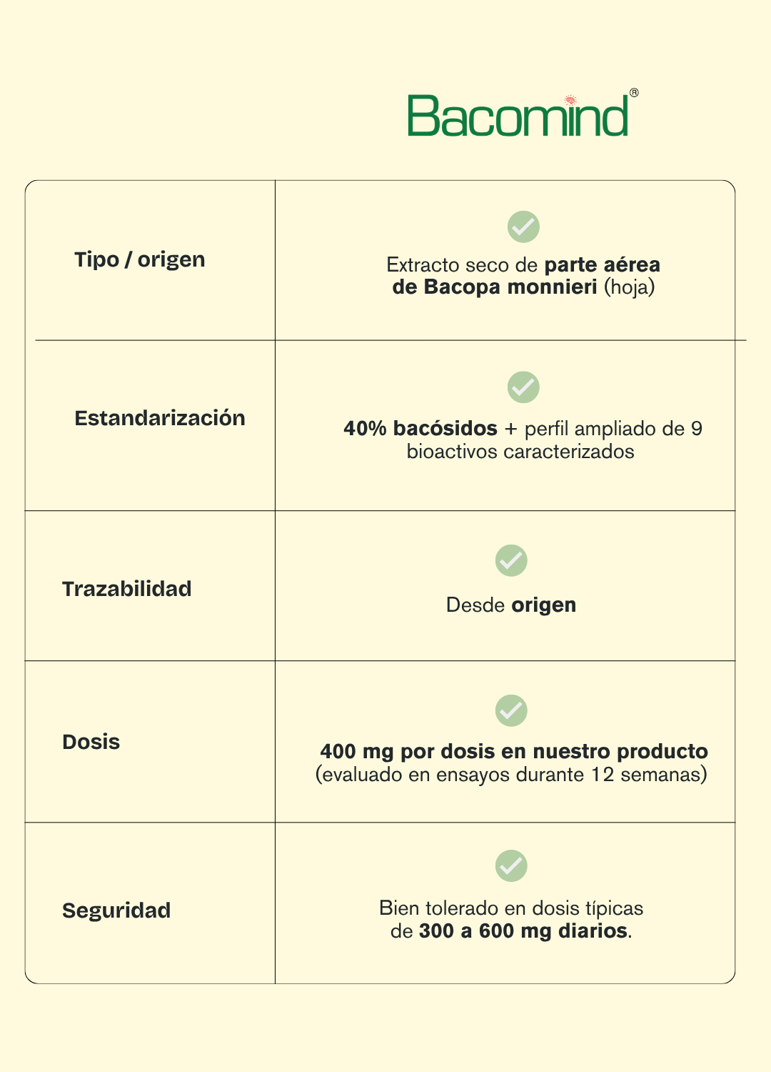 - Extracto seco de bacopa monnieri (parte aérea, estandarizado al 40% en bacósidos) (BacoMind®).