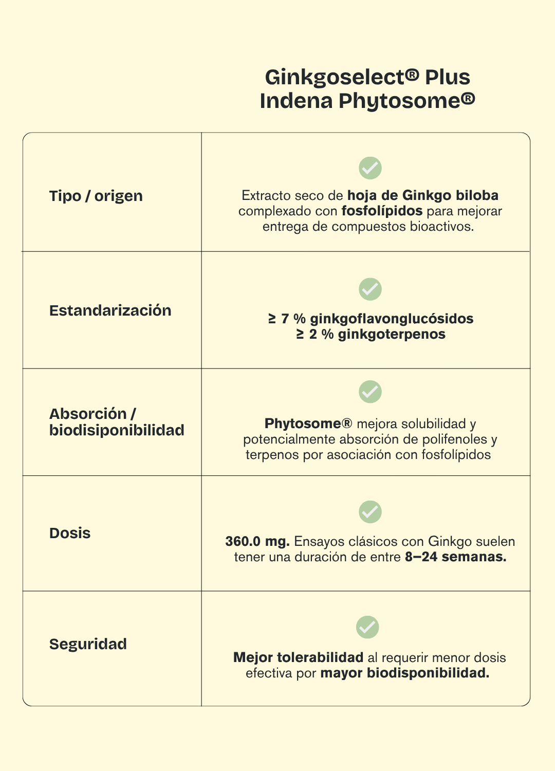 - Extracto seco de ginkgo biloba (hoja, ≥7% ginkgoflavonglucósidos y ≥2% ginkgoterpenos) (Ginkgoselect® Plus Indena Phytosome®).