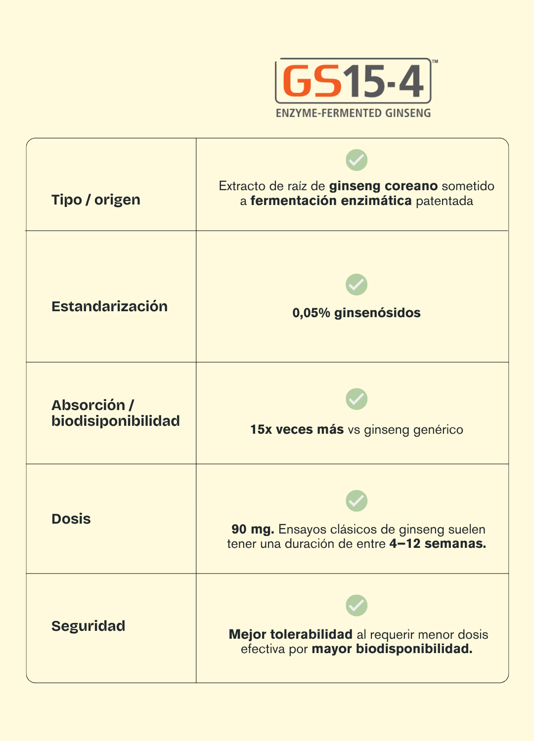 - Mayor potencia con menos dosis: GS15-4®, “el extracto de ginseng del siglo XXI”, se produce utilizando una tecnología innovadora patentada que aprovecha la fermentación enzimática para producir un extracto de ginseng en su forma más biodisponible.